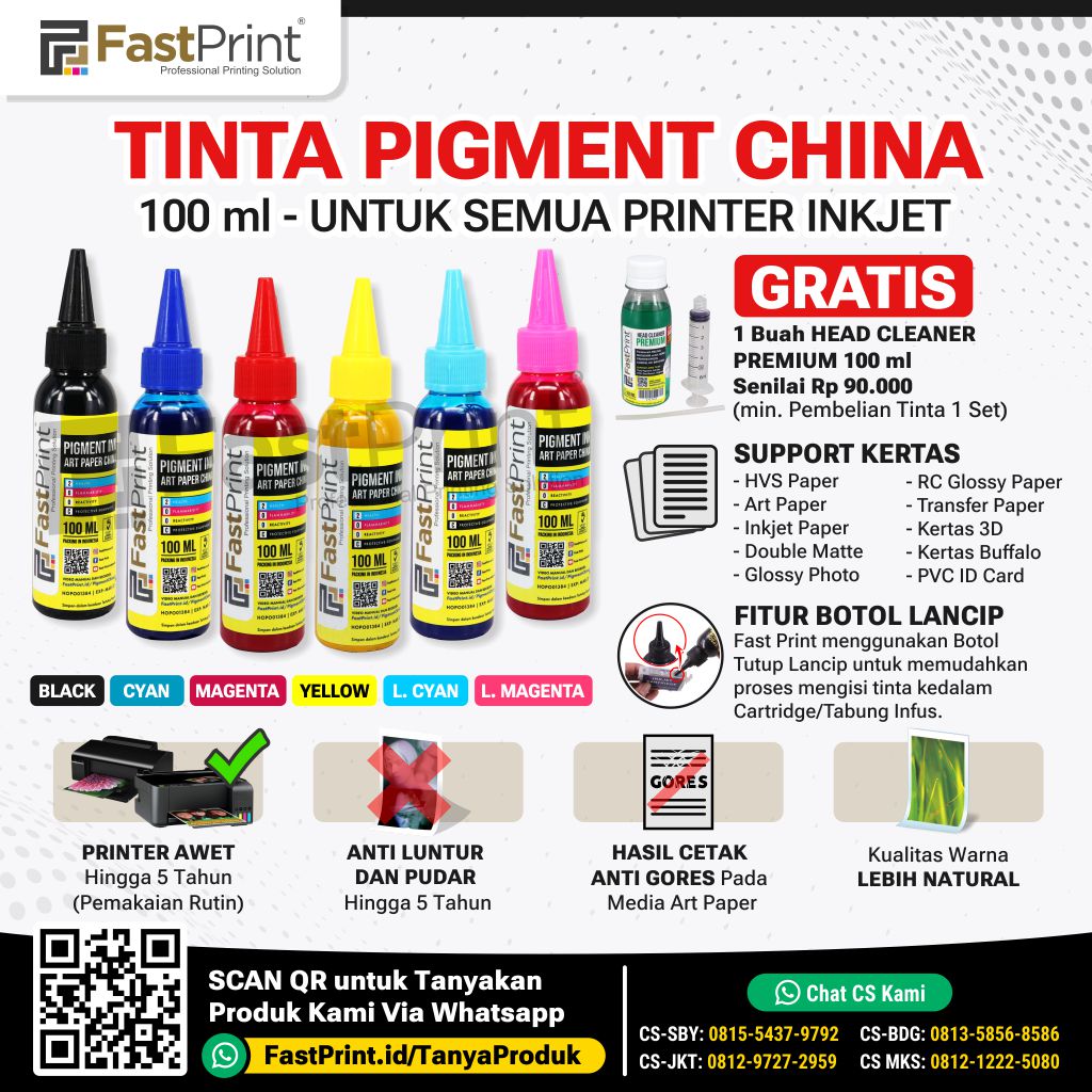 Tinta pigment Fast Print ini lebih tahan luntur, anti pudar, anti gores, dan mampu mengering dengan cepat. Cocok untuk percetakan foto, sablon, stiker, sampai undangan.